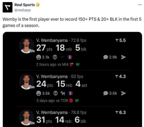 开季至今5场比赛,文班亚马已经拿下151分24盖帽,成为NBA历史上首位在开季前五场能够拿到至少150分20次盖帽的球员。